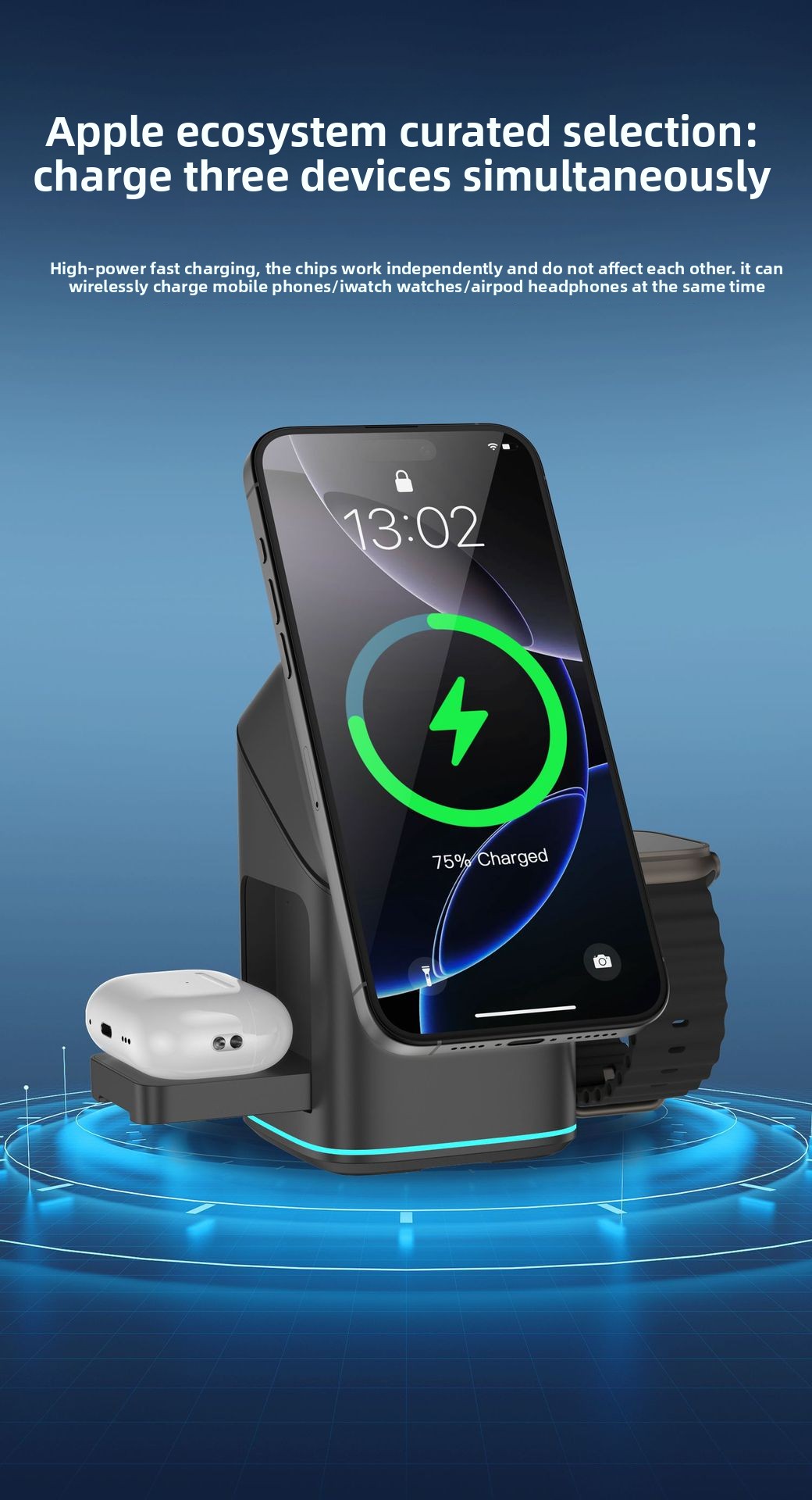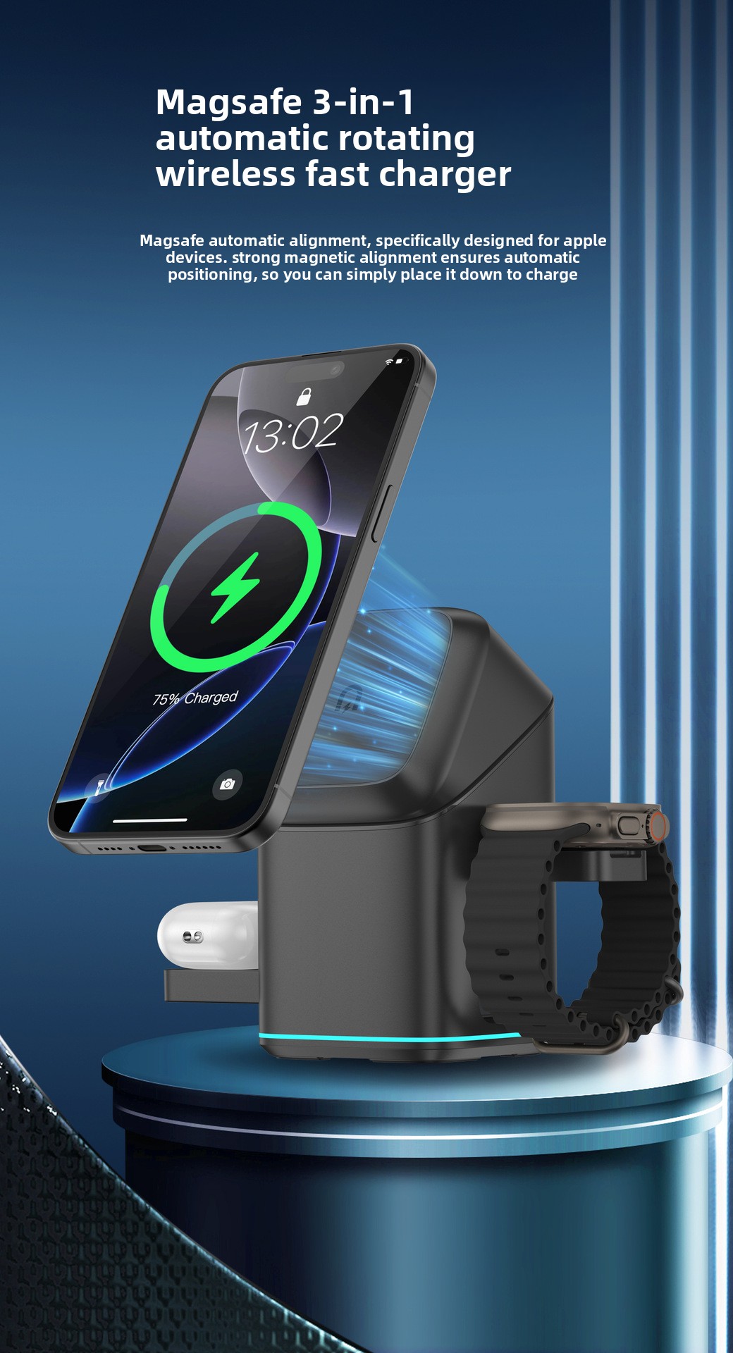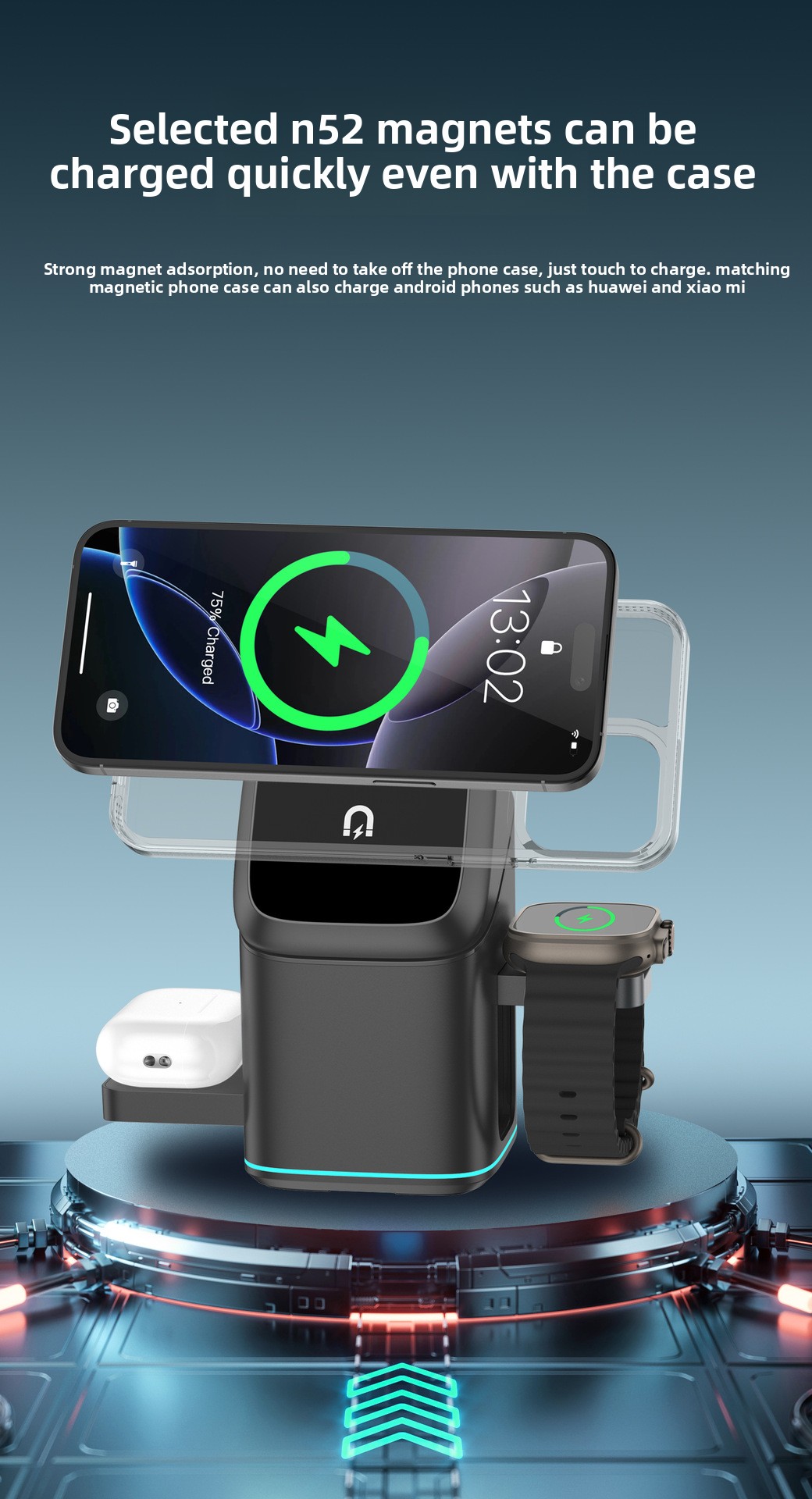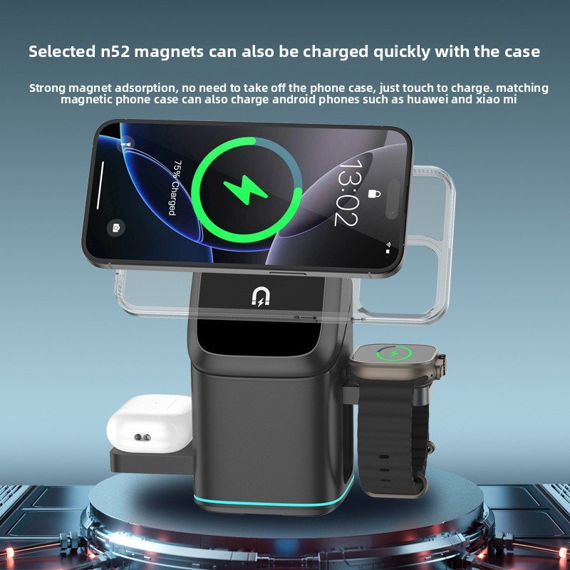 Three-in-One Function – Simultaneously charges phone, watch, and earbuds with magnetic alignment