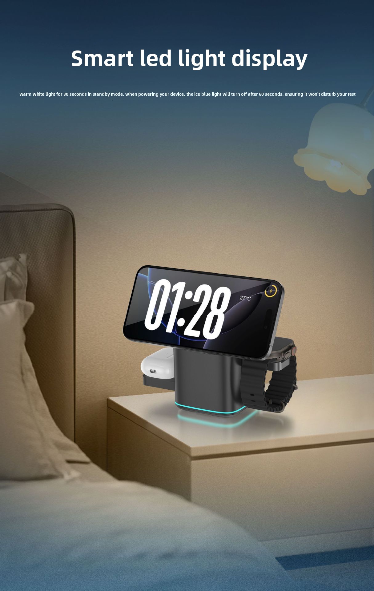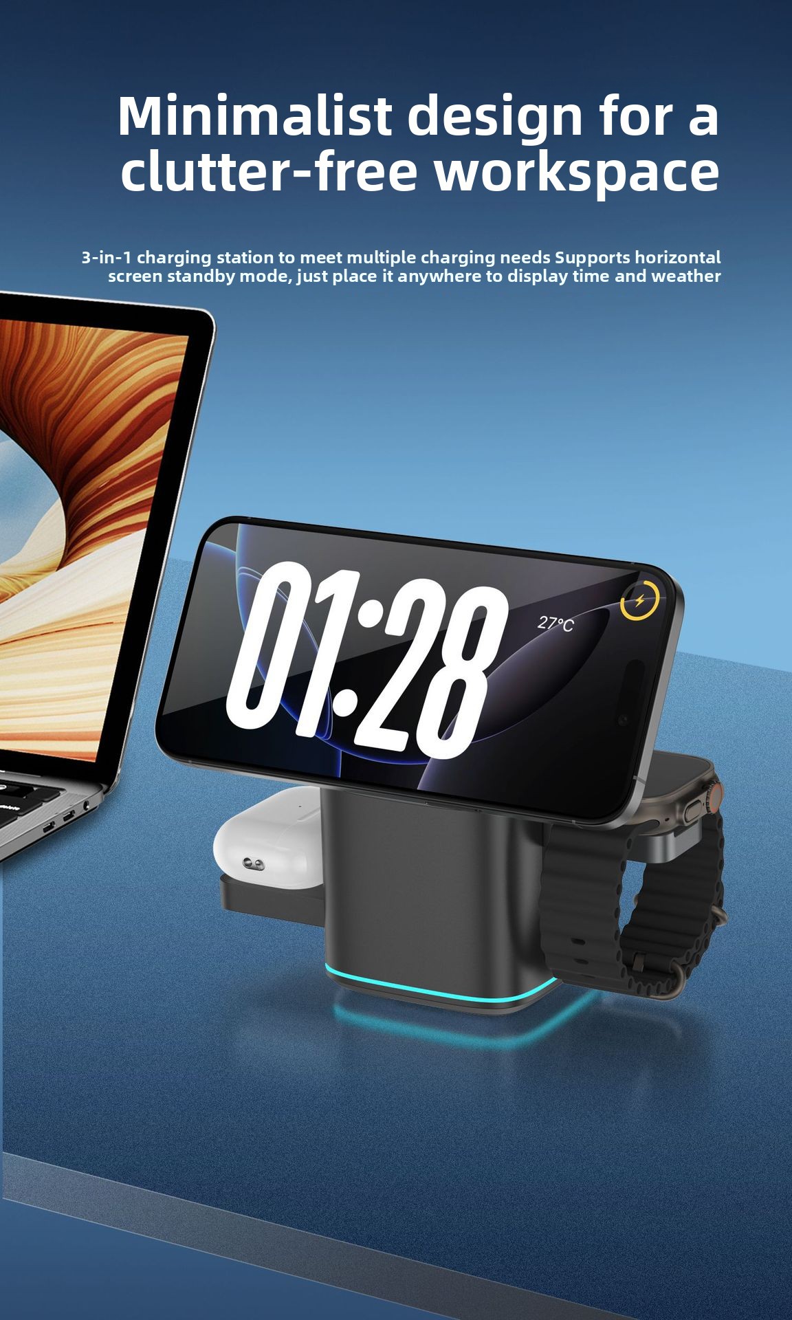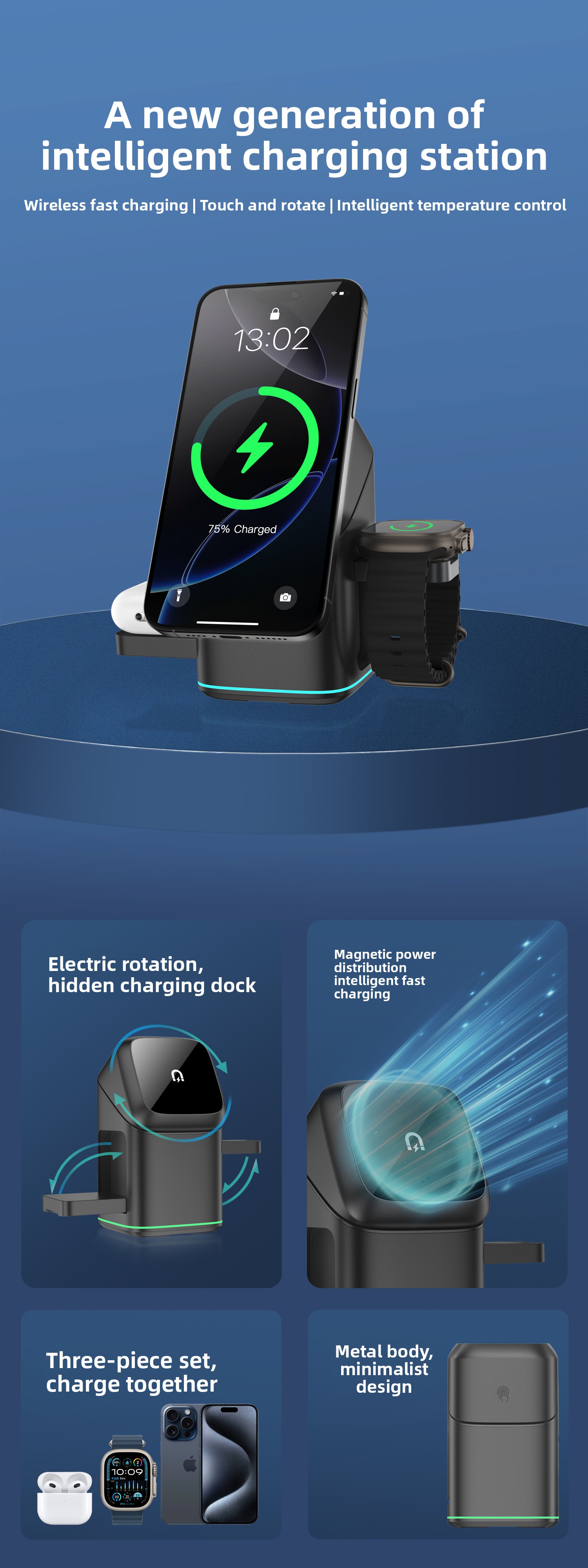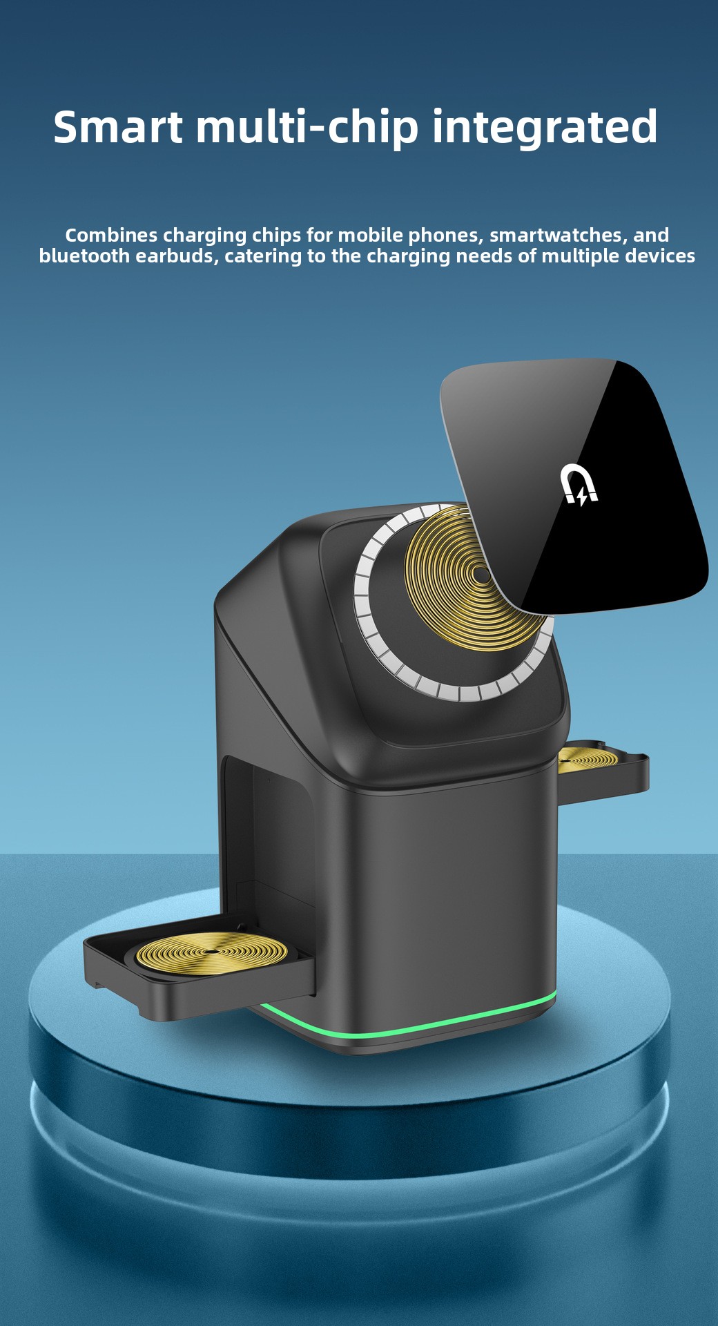 Three-in-One Function – Simultaneously charges phone, watch, and earbuds with magnetic alignment