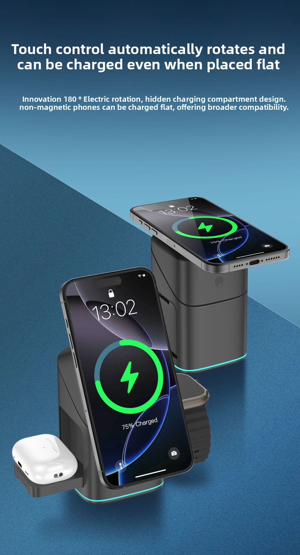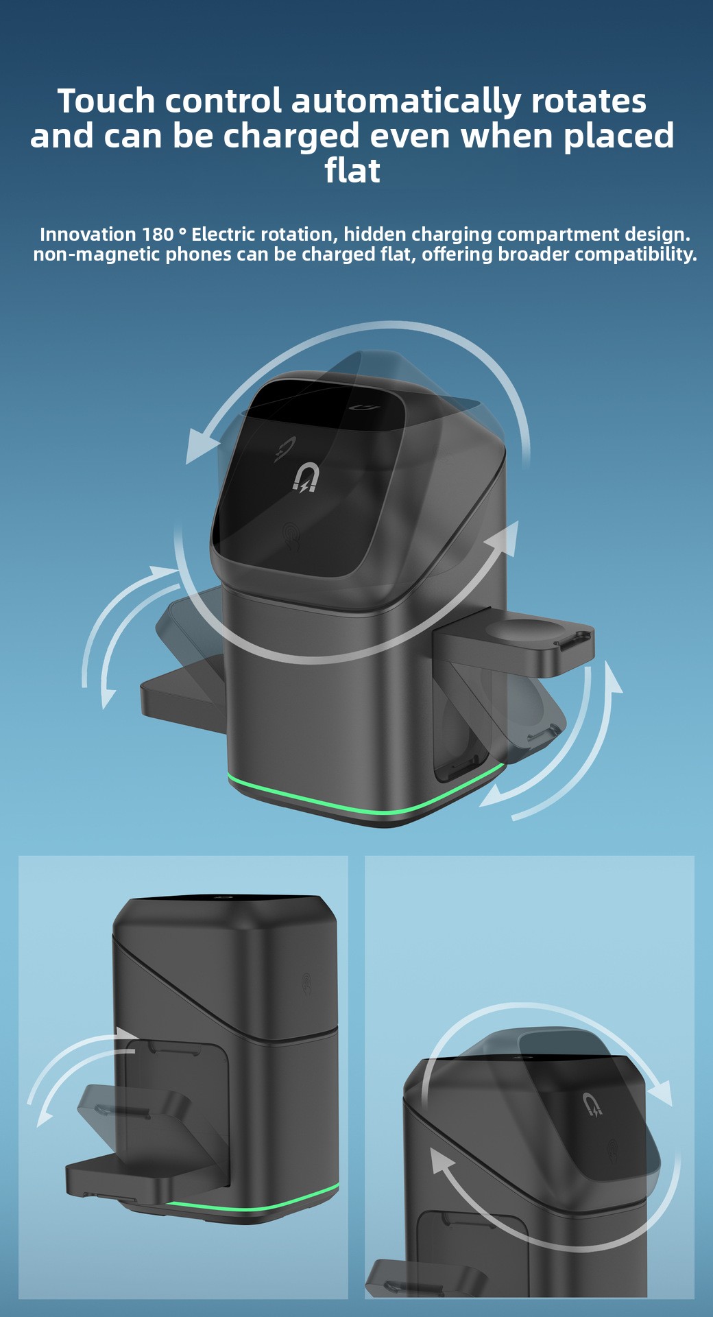 Rotatable Design – 180-degree adjustable stand with touch-controlled electric rotation